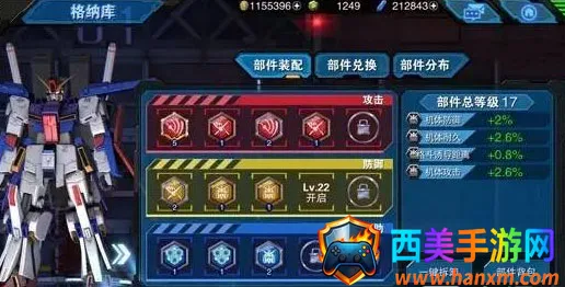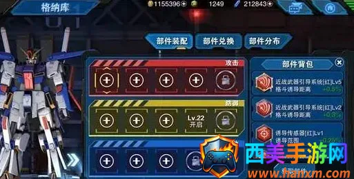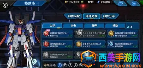2、根据各类部件的能力,均能对机体属性各项进行一定比例的提高,诸如格斗的诱导距离、喷射槽上限、机体耐久与防御的加成等等。