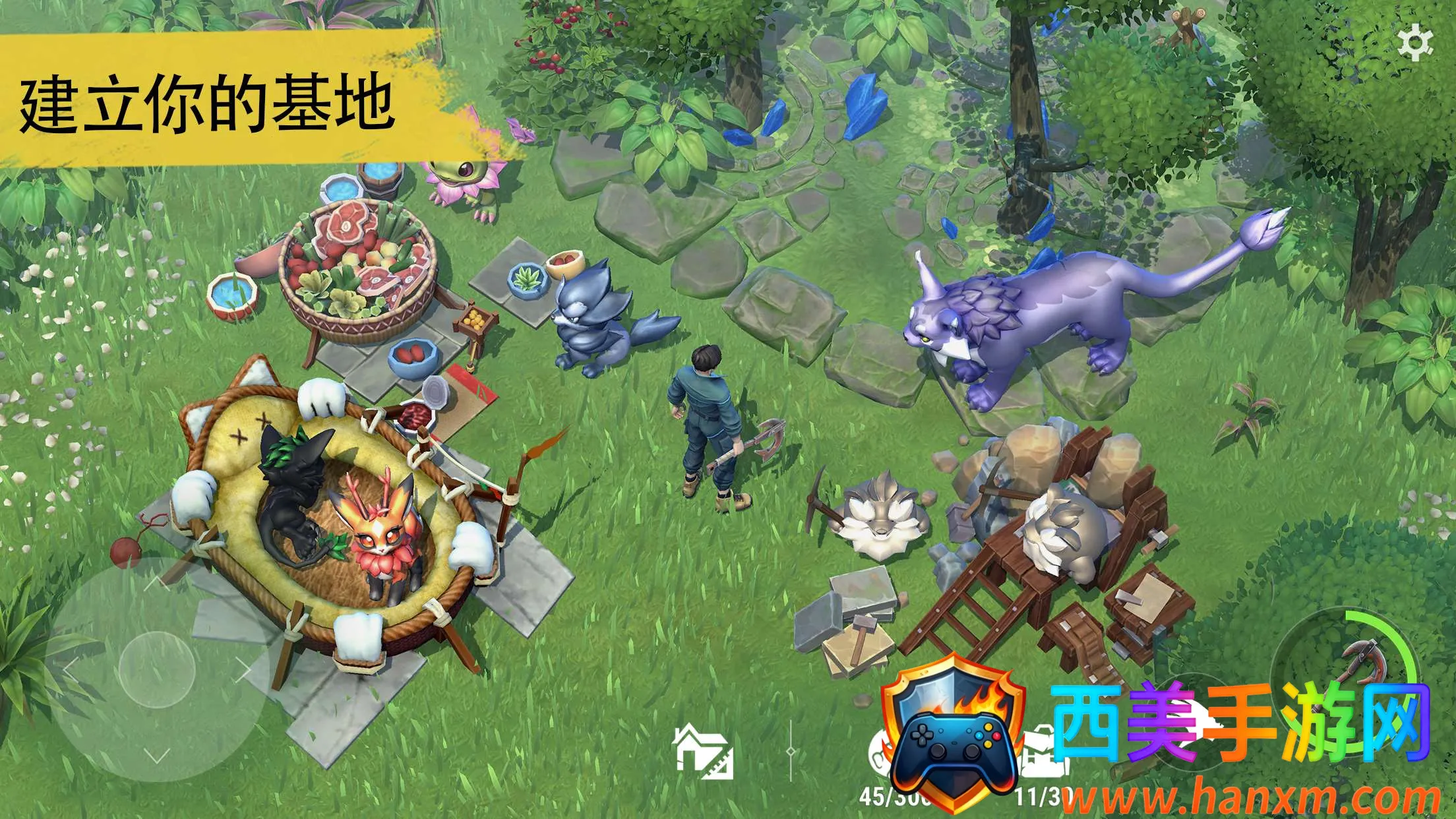 2. 建设专属魔法基地,利用魔法资源材料自由搭建装饰,这里是休息与战略规划、召唤培育Amikins的中心。