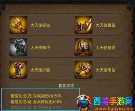 5件金色大天使,没有做任何强化,依然可以激活套装加成(4)。如果身上凑齐6件金色大天使,则可以激活最下面-套装加成(6)对应的属性。