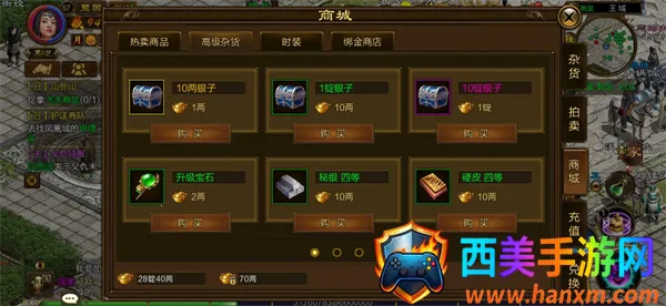 商城有出售升级宝石、硬皮、秘银,只要花费金子就能购买,也可在绑金商店使用绑定金子购买秘银、硬皮。每周商城还会退出限购礼包,可根据自己的策略购买礼包哦!
