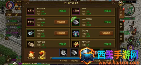 日常活动中有各种日常任务,中立区采集可以获得硬皮、秘银,周游列国奖励藏宝图有几率挖到硬皮、秘银,暗杀太子则可获得魂魄石,BOSS猎杀可获得秘银、硬皮、升级宝石。日常任务奖励的宝箱开启也有概率获得硬皮、秘银、魂魄石。完成日常任务会增加活跃度,达到一定活跃度即可领取秘银、硬皮、魂魄石、升级宝石奖励,日常任务每天一定要完成。
