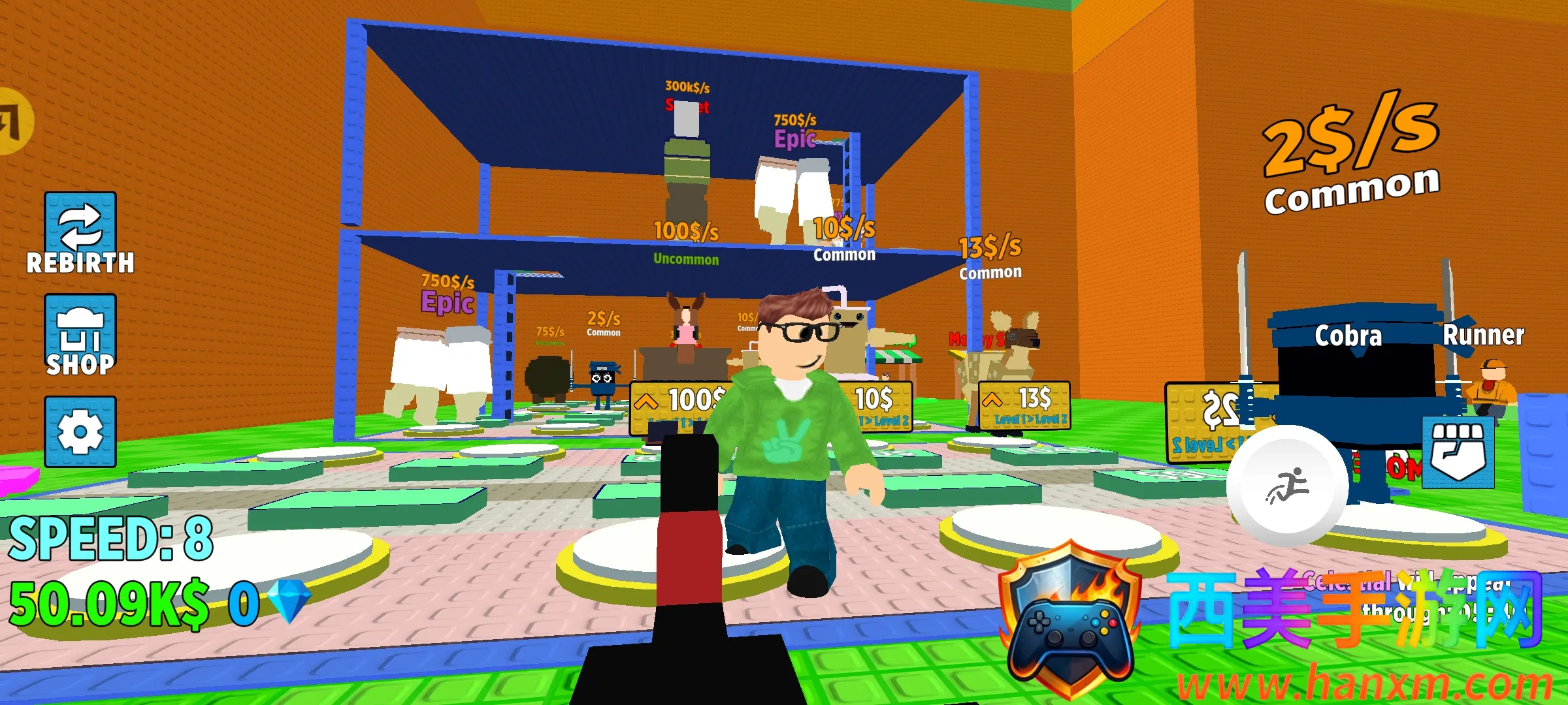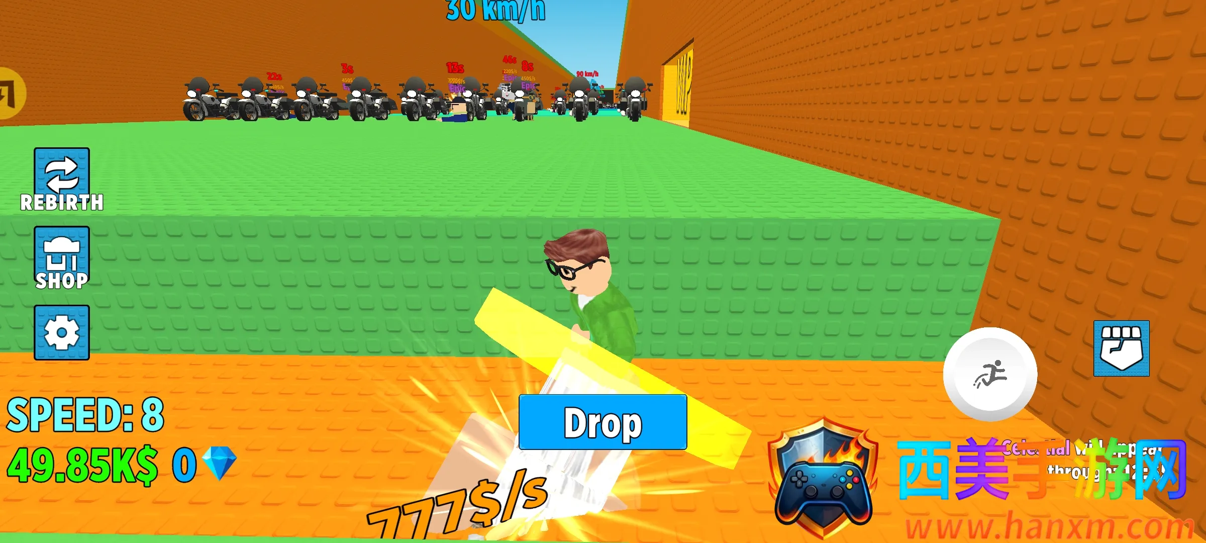 3. 可成长升级系统:能提升移动速度,重生可重置挑战换取倍率,解锁装备新靴子提升速度和操控性,升级机制带来成长感。