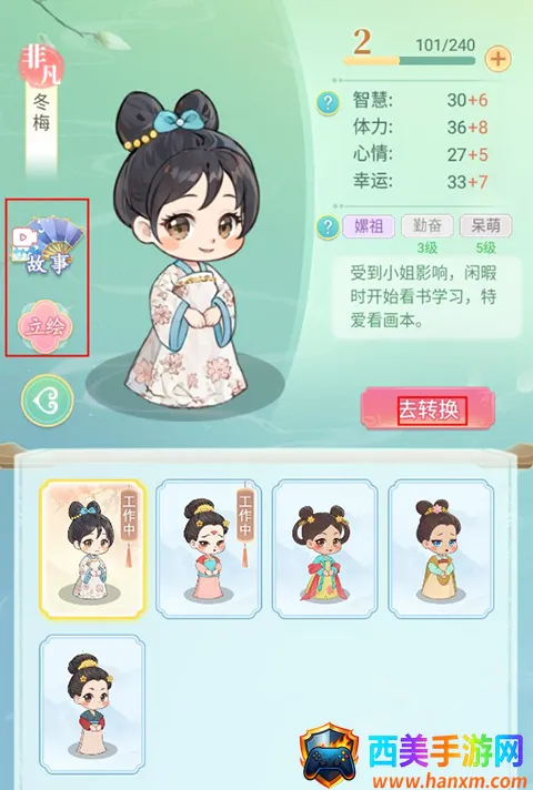 1、完成采女选拔后就会变为宫女,玩家在宫女页面可以查看其信息,还有专属故事以及立绘可以查看。