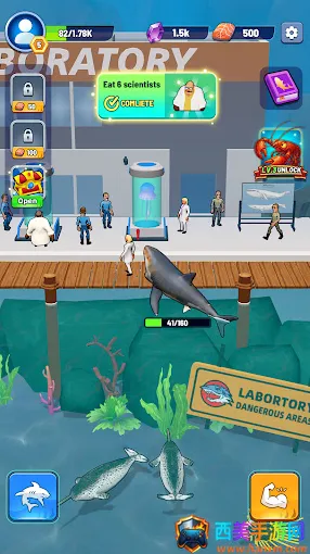 2. 丰富玩法体验:拖动屏幕操控鲨鱼吞噬,获取食物资源升级能力,解锁图鉴、完成任务赢取奖励,还有强大BOSS等你挑战,成功后前往新区域。