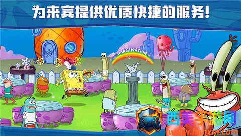 2. 丰富玩法,趣味十足:采用经典模拟经营玩法,融入大量独家剧情。你能参观海绵宝宝地标,制作数百道同款美食,掌握厨艺成大厨。还有超自由DIY玩法,可设计餐厅、为居民换服装。