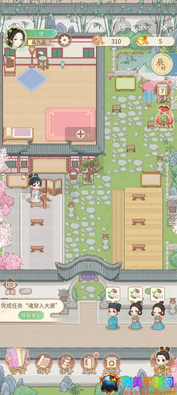 2、玩家扮演穿越者成为宫内底层女官,需经营司织房,发展经济,招揽宫女,扩大势力,提高官位,逆转人生成为掌权者。
