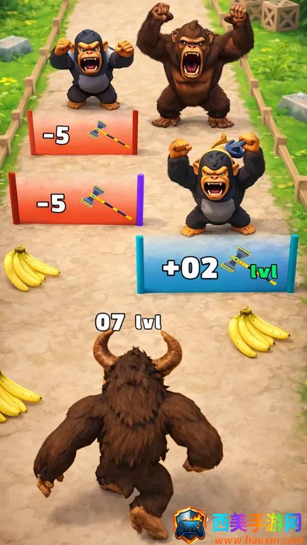 猿猴进化是一款刺激的跑酷游戏,从一只小猿猴开始,左右滑动避开障碍物,吃掉等级低的猿猴加速成长,拾取锤子等道具破障,还要躲开更强的猿猴,冲过终点进化成大猩猩,体验令人上瘾的无尽跑酷。