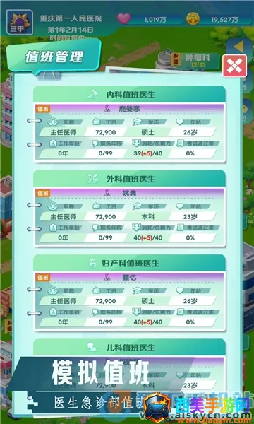 想知道凌晨四点的医院攻略?来玩这款超棒的模拟经营医院游戏呀!在游戏里,你能扮演医院院长。这里有丰富的医生类型,像内科、妇产科、儿科、肿瘤科等,可通过社会招聘、名校招聘、猎头招聘来招募。社会招聘性价比高,名校招聘适合早期,猎头招聘应急后可考虑解雇。聘用后能查看医生职业和治愈率,低就培训或开除。游戏里还有各种随机事件,比如员工涨薪跳槽、病人逃费医闹等,都得合理解决。而且有细腻文字描述、个性化角色设定、丰富游戏模式、多样设施,还有精美的画面与音效,带你感受医院的紧张与真实。从一级丙等升一级乙等阶段,按提示解锁建筑和疾病,合理安排医生精力。还有很多游戏技巧,比如根据经营报表定医生数量、合理安排科室策略等。快来下载体验,开启你的医院经营之旅吧!