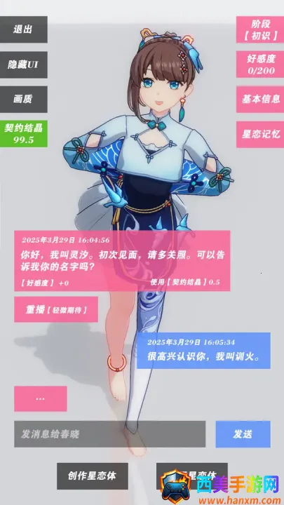 星恋契约是一款3D二次元风格的恋爱养成游戏,接入前沿AI大数据模型。玩家能与AI美少女深度交流,分享日常。有好感度养成系统,还有AI长期记忆等特色功能,能定制角色、自由交谈,快来下载体验。
