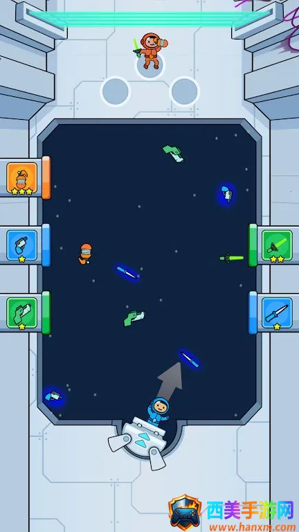 3. 在零重力环境下作战,宇航员需拾取武器、巧妙控制飞行轨迹避开障碍物并收集奖励,玩法独特。