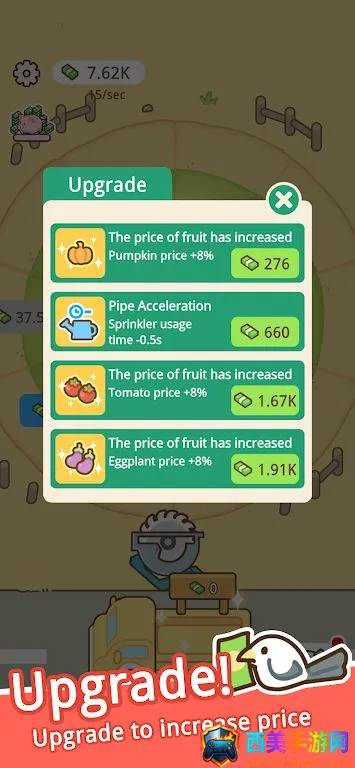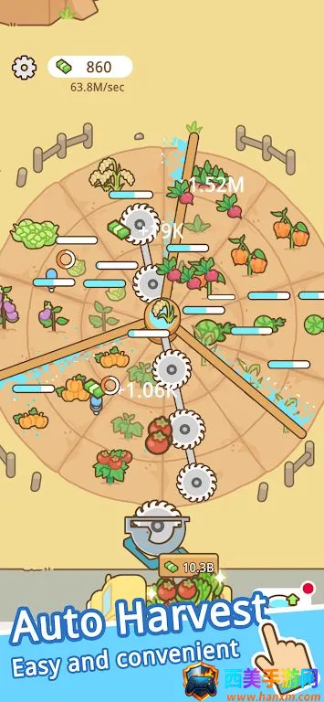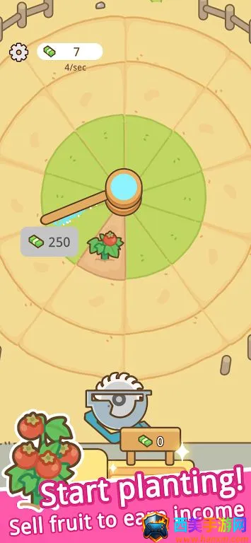 3. 丰富升级体系:切成熟农产品赚取金币,用于升级浇水速度,解锁稀有种子,还能自动收割,逐步建立终极循环农业帝国。