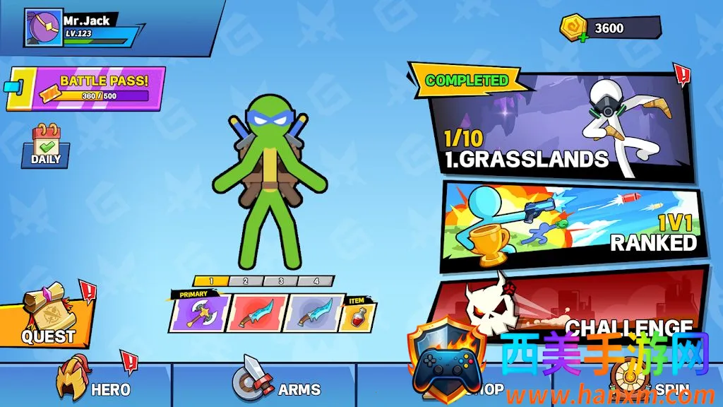3、缤纷多彩的火柴人英雄:众多色彩缤纷的火柴人英雄和皮肤任你选择,自定义战士,在竞技场中脱颖而出。