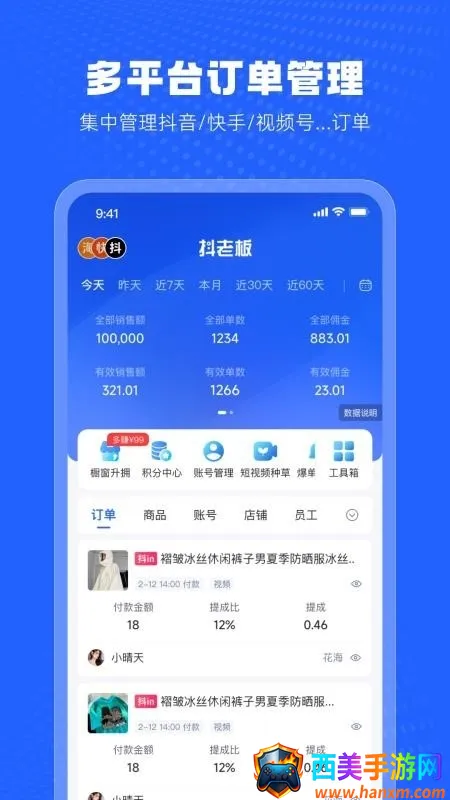 3. 具备订单管理与分析功能,实时同步多平台分销订单,提供多维度销售排行与收益数据分析。