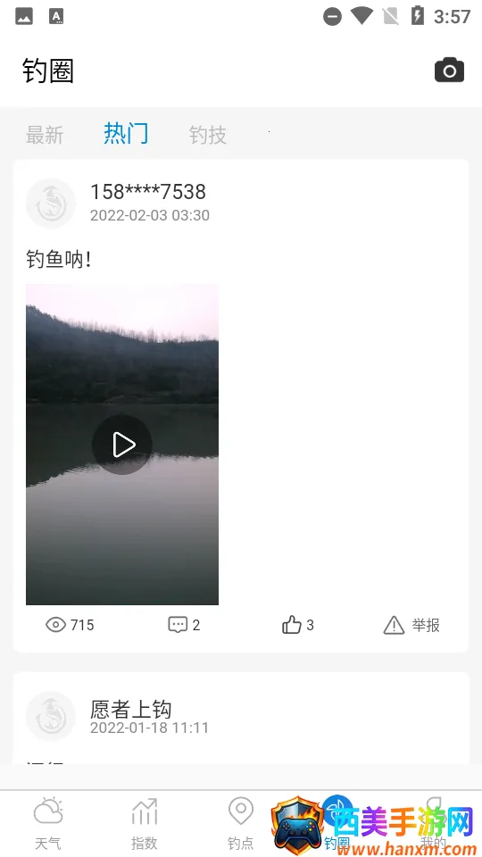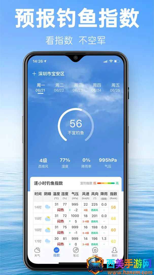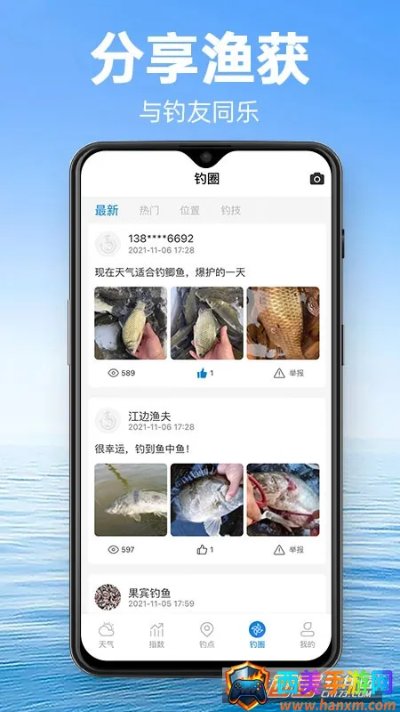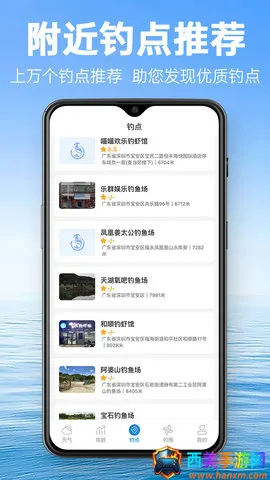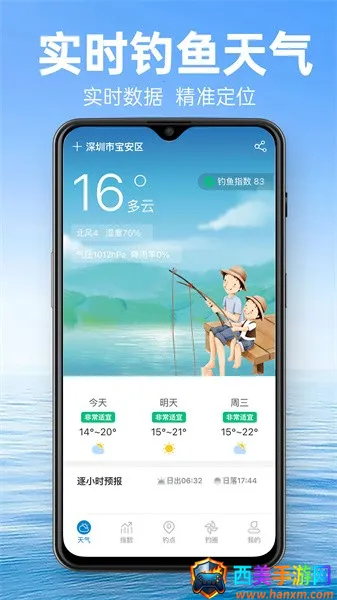 2. 天气数据超精准:提供最专业的垂钓天气指数系统,结合温度、气压、湿度、风速、风向、降水、月相等与钓鱼息息相关的各项指数查询,助你掌握最精准的信息,从容应钓。