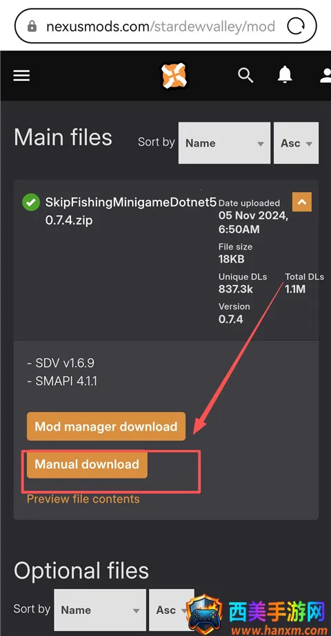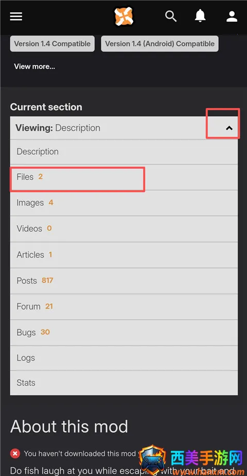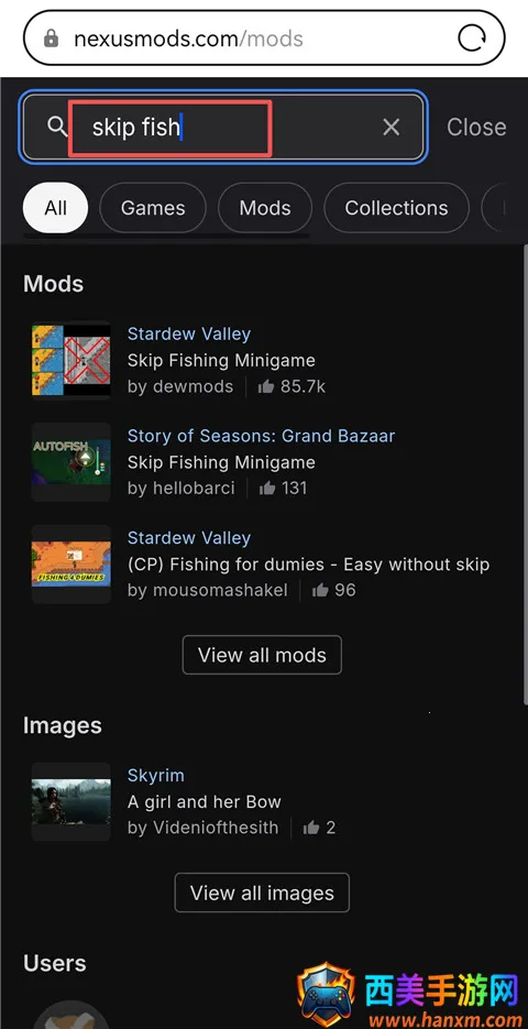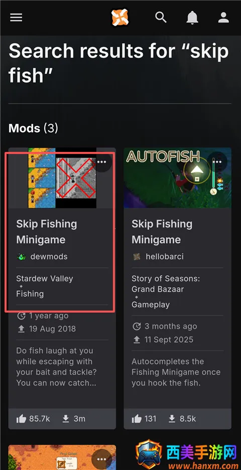 2、然后再搜索栏中搜索自己想要的mod下载,以钓鱼mod为例,搜索skip fish。