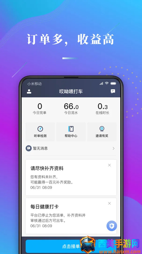 哎呦喂司机app是为司机打造的接单软件,提供合适订单信息助司机更好接单增收。用户活跃订单足,自动同步订单即时接单。平台有全方位保障,操作直观,功能丰富,还能提现,助力司机高效跑单。