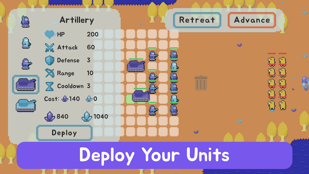 3. 简洁操作,深度策略:界面简洁清晰,玩家战前合理分配单位、调整阵型、选定兵种组合即可,操作虽简但战术深度丰富,考验分析计划能力。