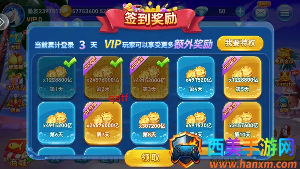 2. 炫酷炮台:免费赠送炫酷永久炮台,为捕鱼增添更多精彩与趣味。