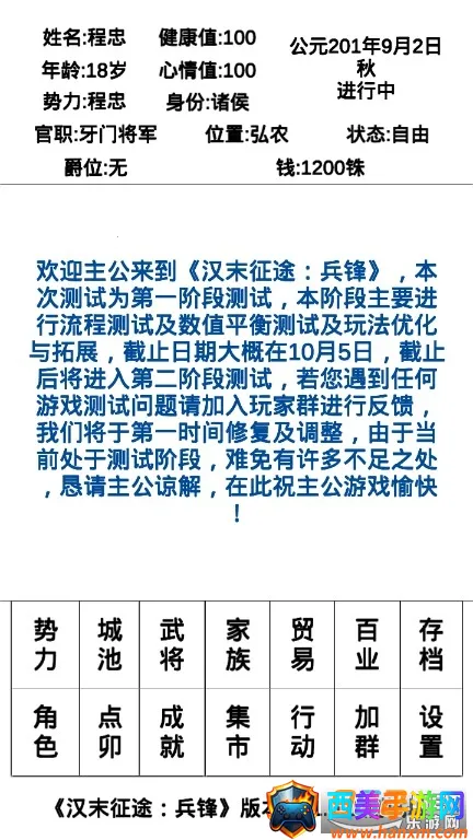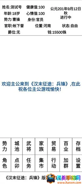 汉末征途兵锋是一款以三国演义为主题的文字类战争策略安卓手游。玩家将在东汉末年群雄逐鹿,通过创建角色开启冒险,经营城池、调度武将、发展商贸,运用策略实现统一三国霸业,玩法丰富,自由度高。