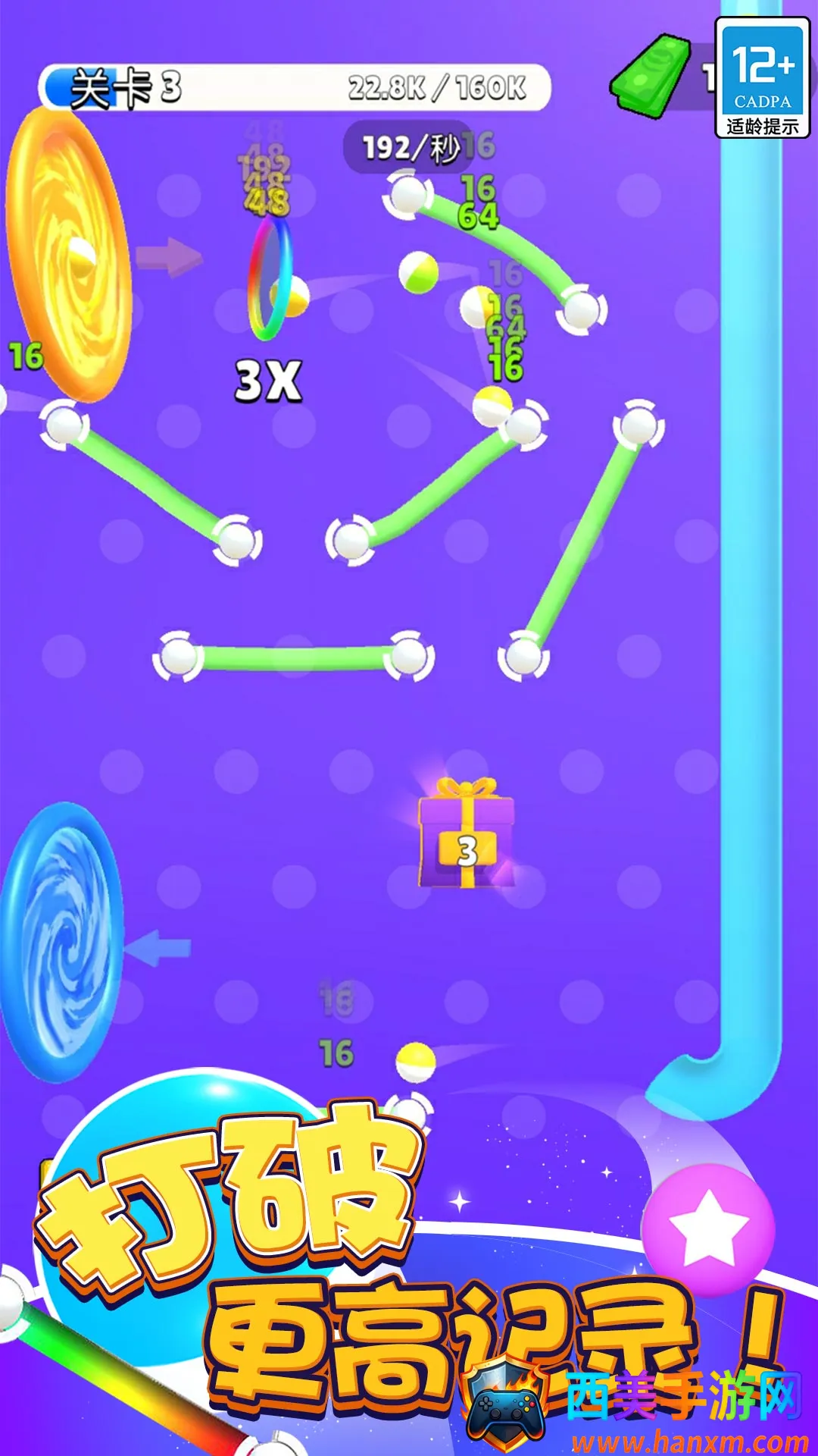 2. 反复弹射超解压:合理摆放阵型,弹球在道具间反复弹射,不断增加的分数带来畅爽解压体验。