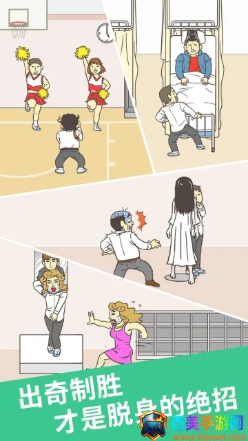 游戏玩法丰富,你得仔细观察场景找隐藏道具并巧妙使用。比如要躲避地中海老师的追捕完成翘课目标,像第1关直接躲在狮子雕像后;第2关在右侧获取队服穿上;第3关在屋子拿铲子、屋顶拿席子,在右侧挖坑用席子盖住,躺石台上等。遇到困难别担心,观看动画就能获得提示。还有多达54个游戏关卡,各种意想不到的沙雕结局。游戏画面简洁,是卡通风格立绘。操作简单,单手就能玩。它能让你体验到别样的翘课冒险,感受脑洞大开的乐趣,快来试试吧,看看你能不能顺利闯过23关!