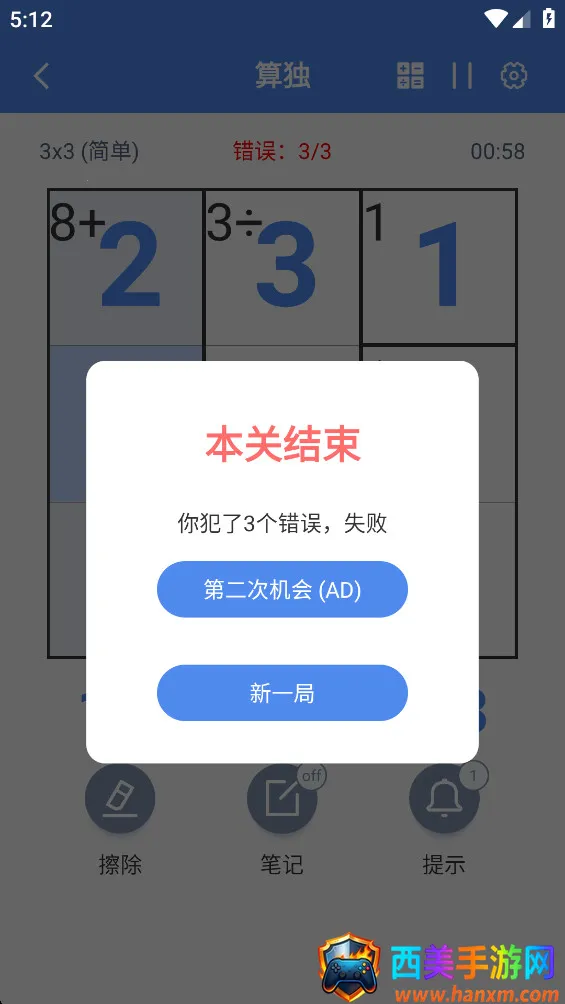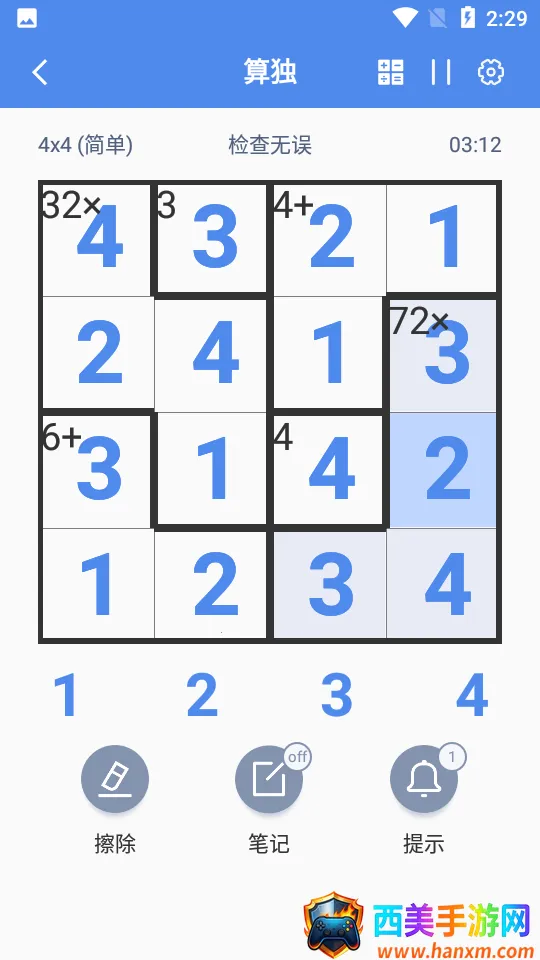 3. 具备实用功能,如内置计算器辅助复杂运算,设置选项支持错误高亮显示及音效开关,还有统计功能和笔记模式辅助填数。