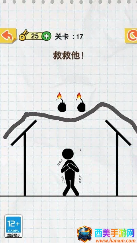 4、17关界面如图所示,顶部的炸弹会攻击火柴人,通过一笔画线的方式拦截炸弹