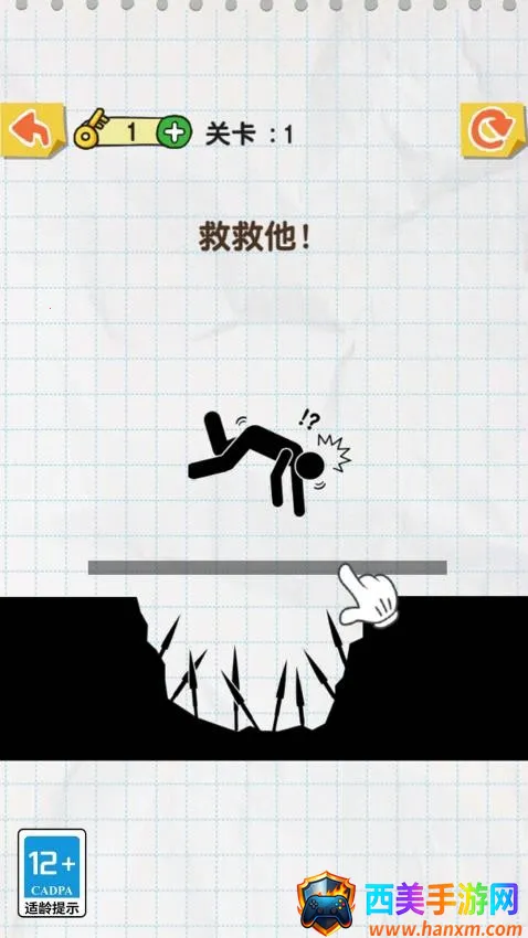 5、第一关很简单,直接画一条横线就可以阻止角色掉落到陷阱里面