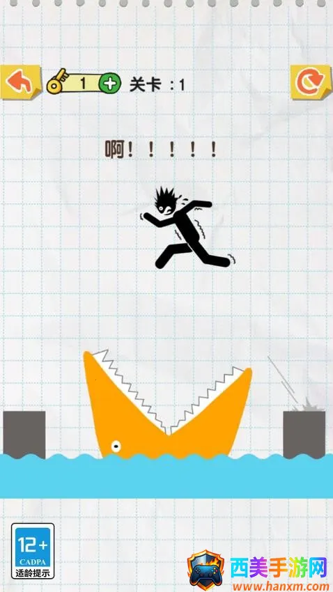 3、鲨鱼会吃掉火柴人,你需要通过画线的方式让角色不会掉落到鲨鱼的嘴巴