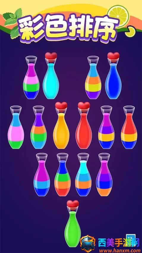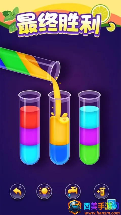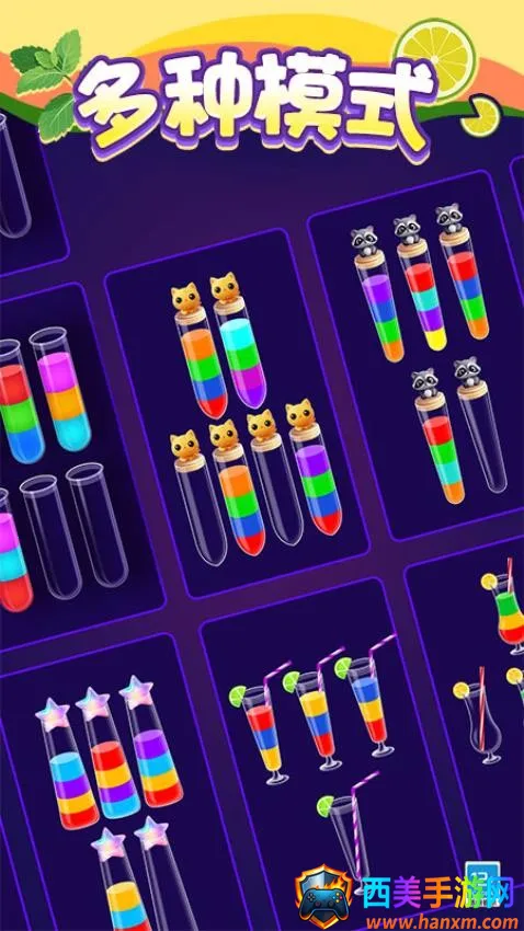色彩缤纷的背景设置在一个色彩斑斓的液体世界,玩家需要利用简单的拖放操作进行液体排序,将相同颜色的液体完美排序就能顺利完成挑战。