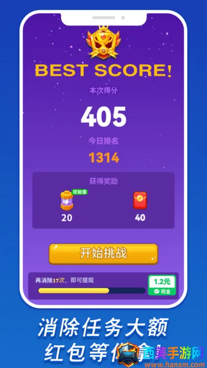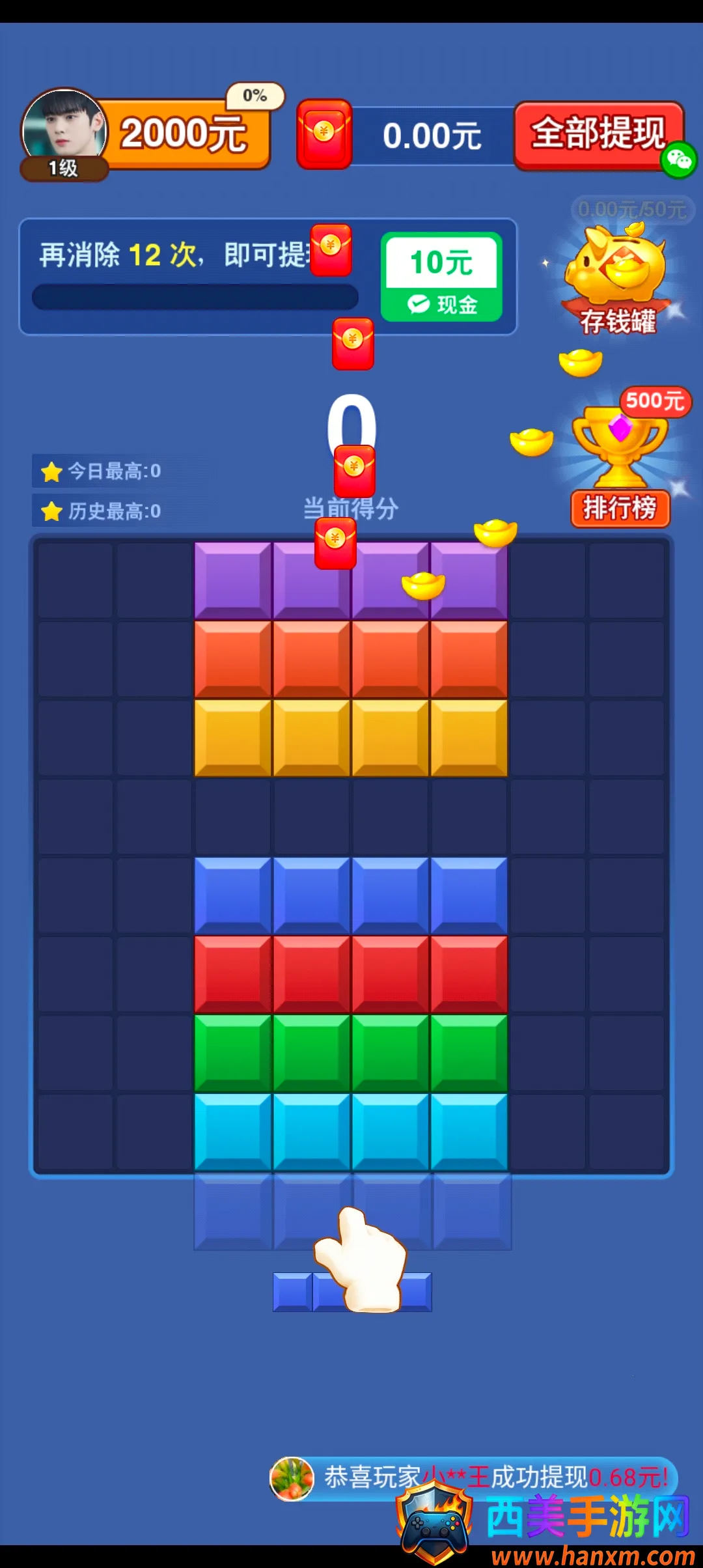 这是一款充满趣味的休闲益智消除游戏。它有着丰富的关卡,难度随关卡解锁逐渐增加,极具挑战性。操作简单,轻松上手。每次消除都有积分奖励,连续消除奖励翻倍,完成任务还有额外收获。游戏画面精美,方块外观可爱。多种有趣模式,带来更多欢乐体验。在这里,你能畅享精彩挑战,用自己的智慧不断闯关获取奖励,无论是想打发时间还是赚取红包,它都能满足你,快来加入这场欢乐的消除之旅吧!