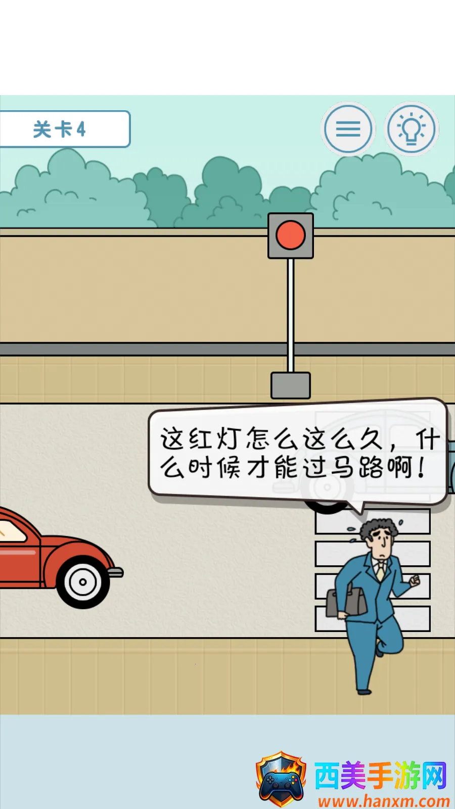 3、谜题无厘头,有着各种奇葩障碍,如突然出现的汽车、陌生人恶作剧等,充满了搞笑与乐趣,能让玩家在解谜中开怀大笑。