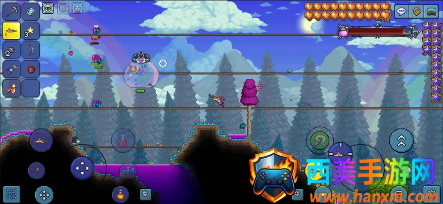 2. 丰富多样的世界探索。游戏世界可破坏,破坏障碍物能找资源,地面有日夜交替,地下更是刺激,有各种怪物和稀有材料,还有超20个生物群落和迷你生物群落,从森林到沙漠,从地下城到腐败之地等,都能探索。