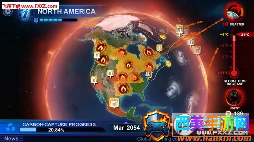 进入游戏后,主菜单新游戏选项三大板块并列。选项面板可整合语言、音效、特效参数,中文界面清晰,特效调至低档位保障流畅。北美洲地图能显示全球温度,待激活五座城市后启动投资计划。各大洲列表可点击新增住宅用地按钮投入资金,资金收益实时反馈,推动温度攀升。