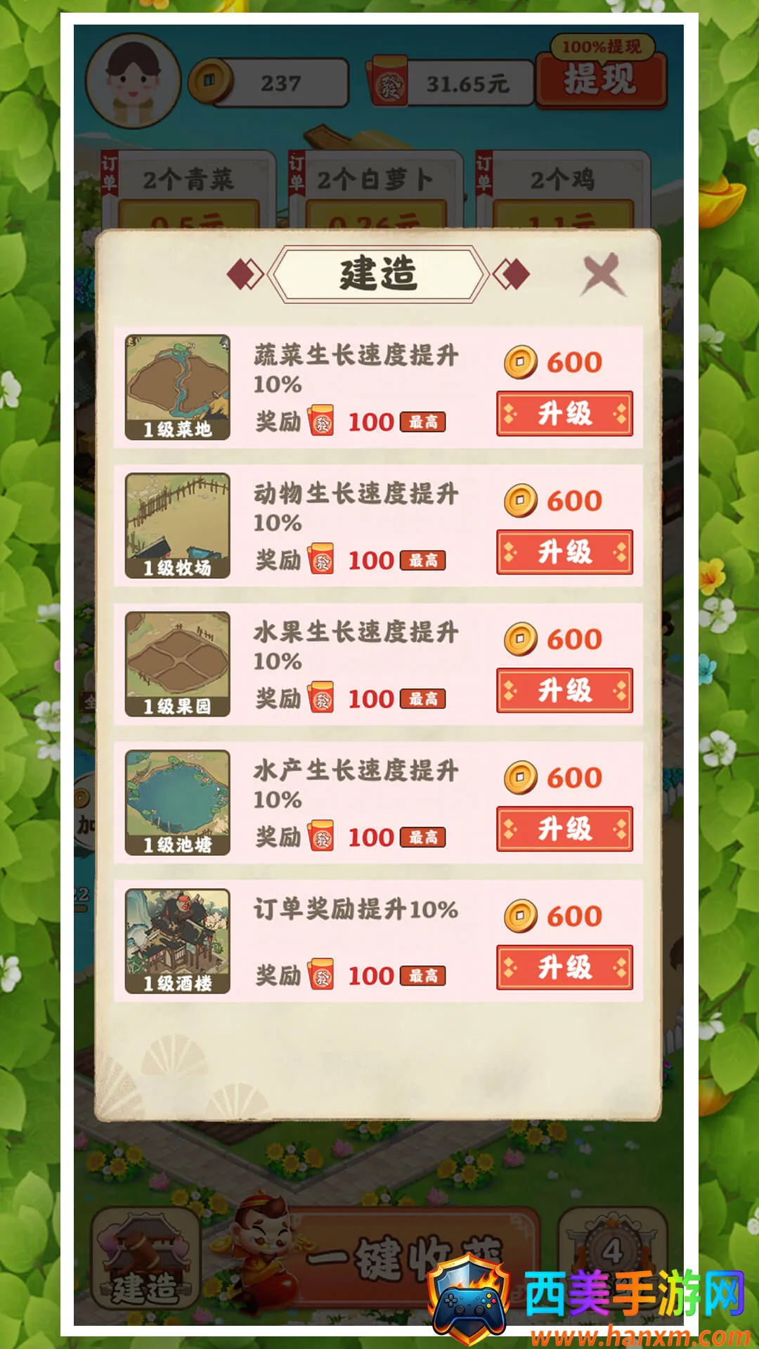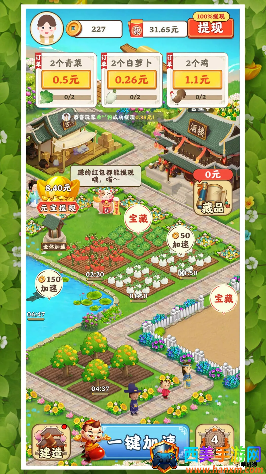 花园小农场是一款超有趣的农场模拟经营游戏。在这儿,你能体验当农场主的快乐,自由种植各类作物、养殖可爱动物。它融合休闲与策略,从种植到收割,再到销售农产品,每个环节都乐趣十足。完成任务不仅能获得金币和丰厚奖励,用来买种子、装饰农场,还能解锁新区域与功能,扩大农场规模。游戏画面卡通可爱,背景音乐轻松愉快,操作简单易上手。而且,它还有红包奖励哦!种植农作物收获时能得红包,新人登录送 28 元红包,完成第二个订单得 1.8 红包,完成 5 个订单以上兑换比例还能提高。只要你有时间玩,按照订单要求完成任务,就能拿到不少红包,满足提现需求。既能享受农场经营的乐趣,又能有点小收益,赶紧来试试吧!