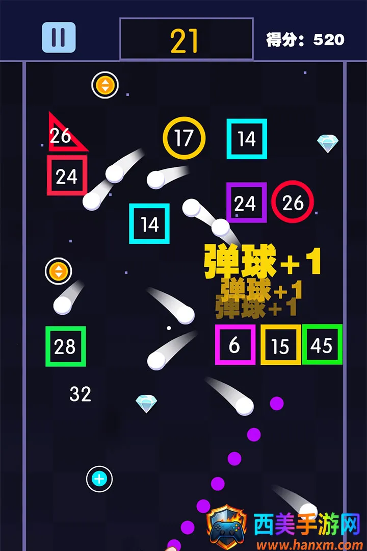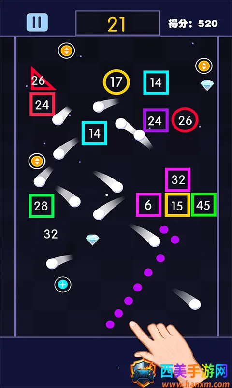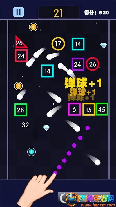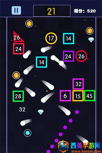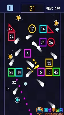 在游戏里,长按屏幕水平拖动可精准瞄准数字方块,一击发射超带感。利用发射角度消除下落方块,击打方块能收集分数,方块上数字指示消除所需击打次数,策略思维很关键。