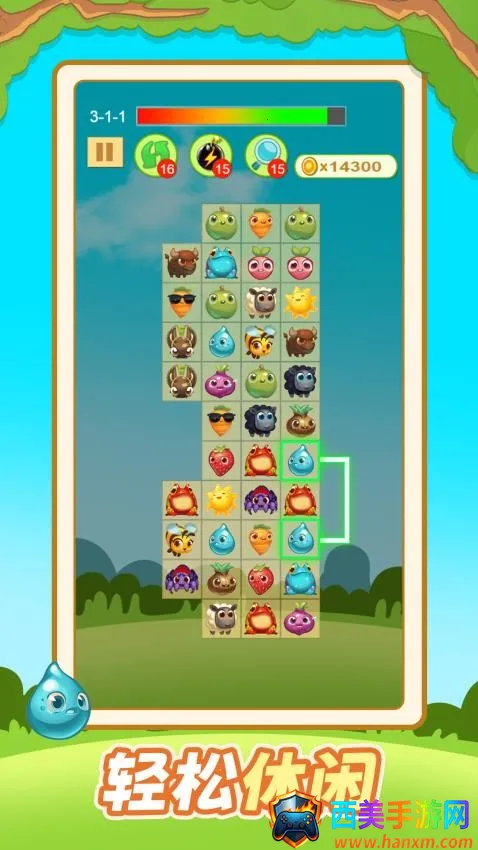 2、点击开始第一关,能够见到许多的消除元素,包括了水滴、青蛙、胡萝卜等,找到适合的元素进行消除。