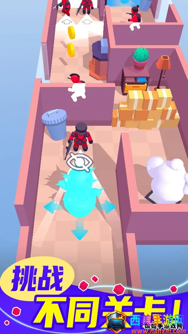百变潜行是一款卡通风格益智休闲动作游戏。玩家在多样房间躲猫猫,借助变身藏身形,利用地形道具完成任务,躲避敌人视线。操作简单,模式场景丰富,有多种道具技能,能带来轻松欢乐的潜行闯关体验。