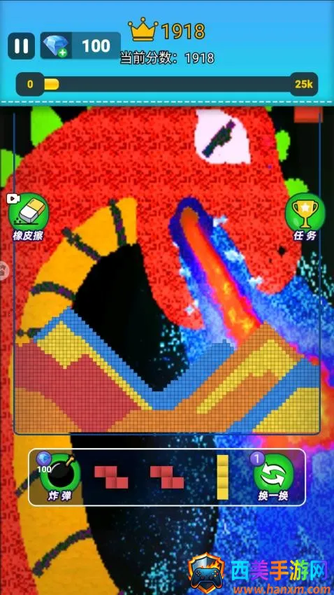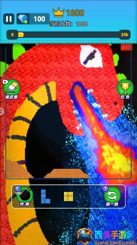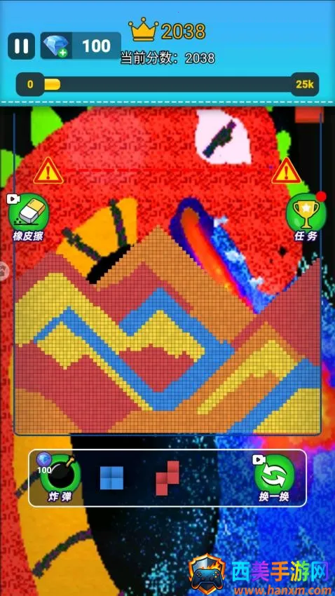 1、待选粉末方块区域会中出现了蓝色和黄色这两个方块,你需逐步将它们放在适合的区域中,更容易消除。
