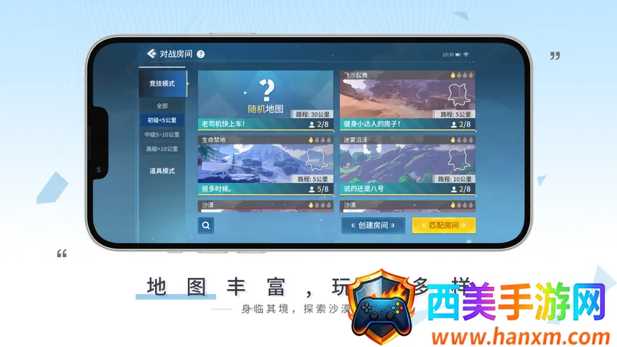 - **丰富地图场景**:短中长赛道搭配沙漠、沼泽等多样场景,还有多种环境音效,带来沉浸式体验。