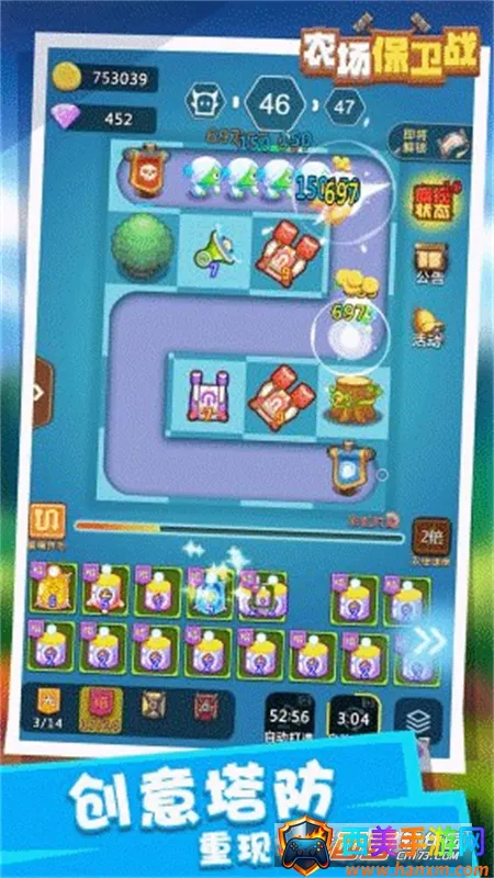 多样策略玩法超精彩,从研究进化到铭文升级,每一步都充满乐趣。运用高峰战术能有效击退敌军,体验攻守转换的快感。沙盒战场的模拟战争,既有趣又能锻炼战略思维。快速招募士兵虽有挑战,但完成后带来全新体验。游戏设计人性化,有放置挂机功能可解放双手。合成塔楼能迅速提升塔防战斗力,增强防御效果,让玩家轻松应对各种情况,享受保卫农场的乐趣。