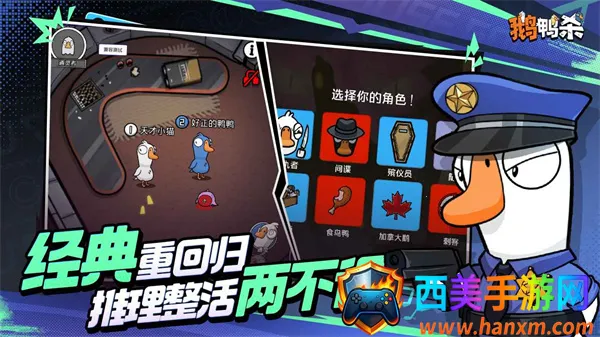 1. 多样阵营与角色:玩家可选择加入鹅、鸭或中立阵营。鹅阵营需团队合作完成任务并揭露鸭子;鸭阵营靠伪装和暗杀制造混乱;中立角色目标独立,增加游戏变数与趣味性。每个阵营和角色都有独特玩法,如加拿大鹅被鸭子杀后杀手会自动报告,食鸟鸭能吃尸体阻止举报等。