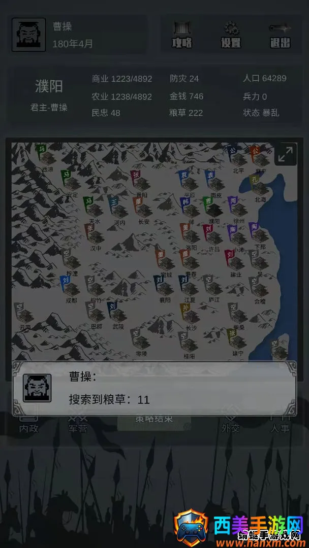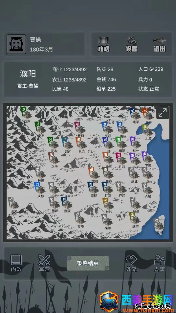 以经典三国故事为题材,为玩家呈现庞大三国世界,诸多精彩历史故事深度呈现。游戏整体以文字形式展现,内容丰富。玩家能化身诸侯,招募名将组建军队,与各方势力角逐。可通过多种指令发展内政、外交、人事、军事等,体验英雄豪情与智谋较量,感受全新策略玩法,在这乱世中开创属于自己的未来,成为枭雄霸主。