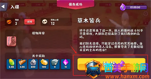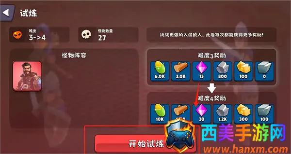 点击入侵之后,可以看到右上角有一个试炼按钮。点击试炼,会升级难度,增加敌人数量及战力。但是后续可以获取更多的紫宝石哦!