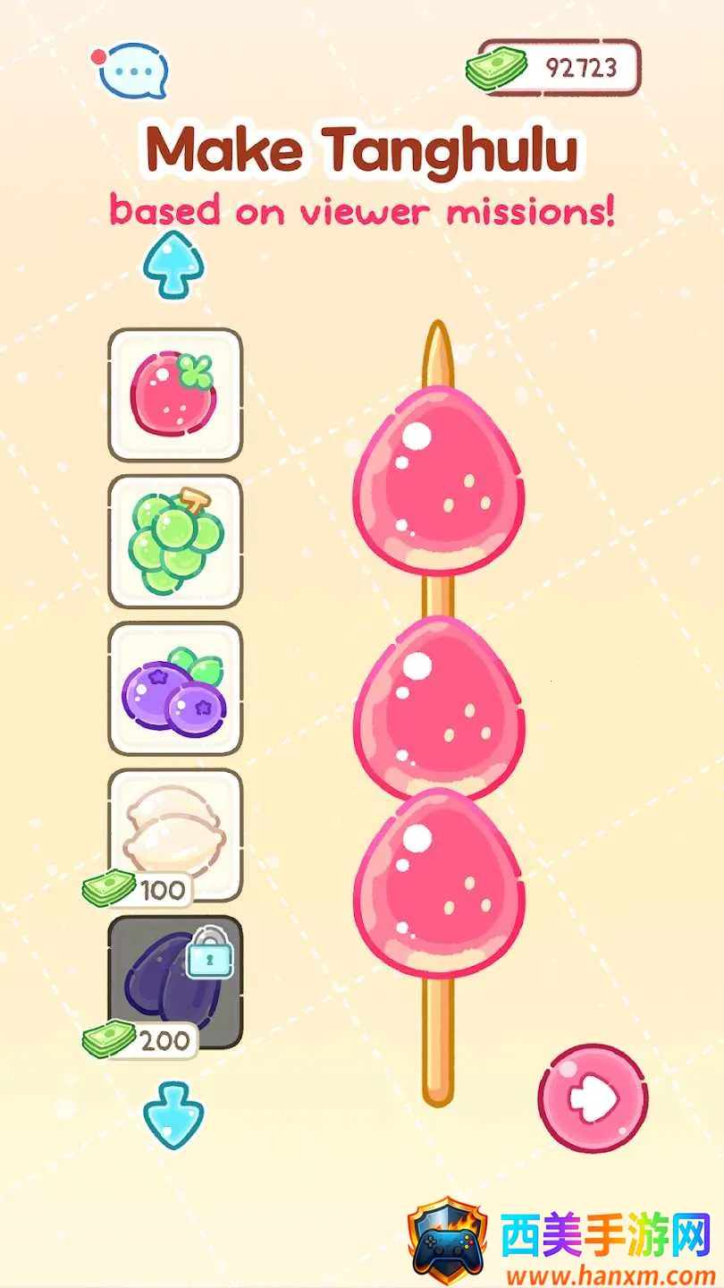 2、丰富多变的食材组合,超30种可解锁食材与10特色糖衣配方,支持甜咸酸辣自由混搭,能打造出各种独特口味的糖葫芦。
